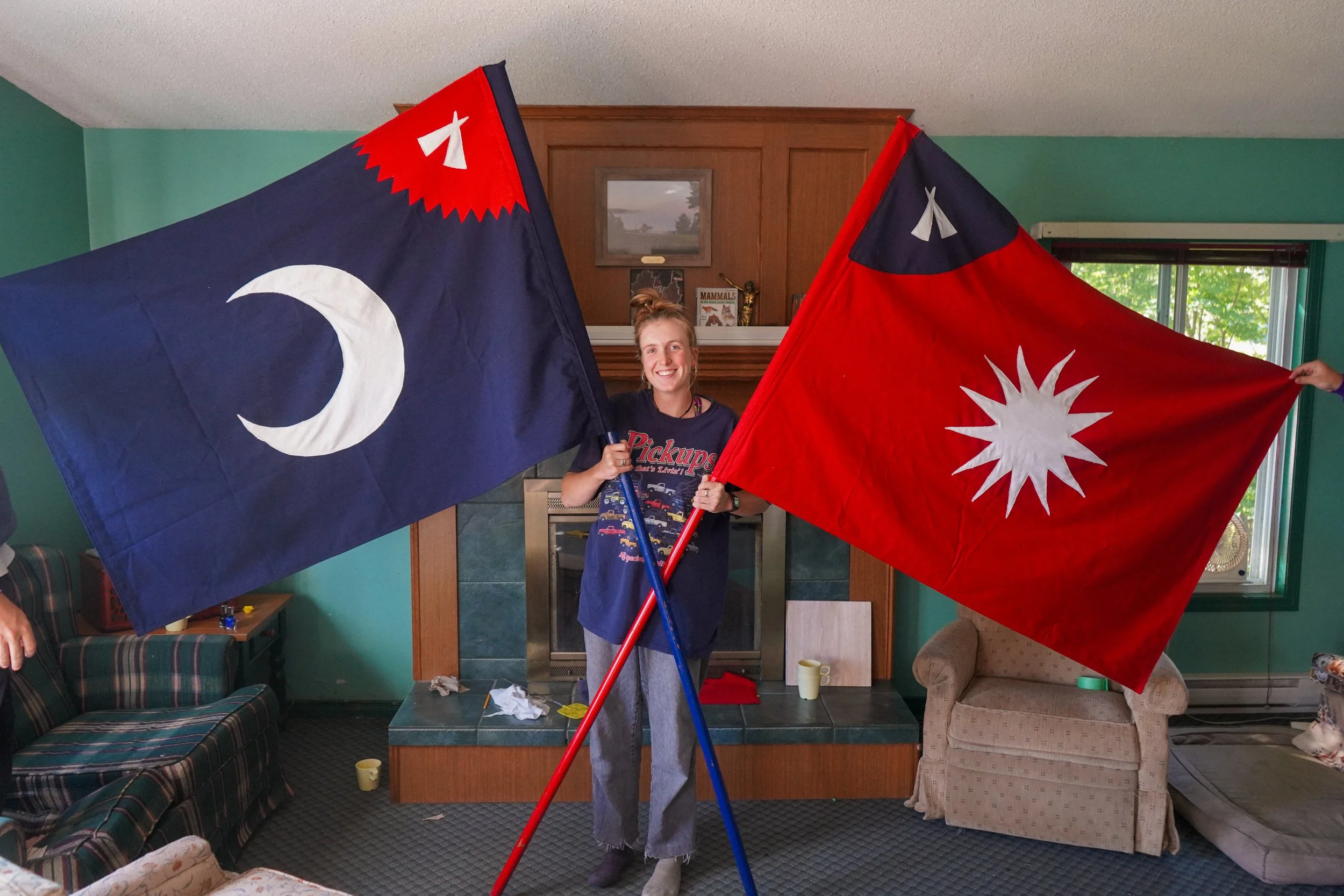 My sister, Quinn, posing with the beautiful new nation flags she handmade - some incredible objects.